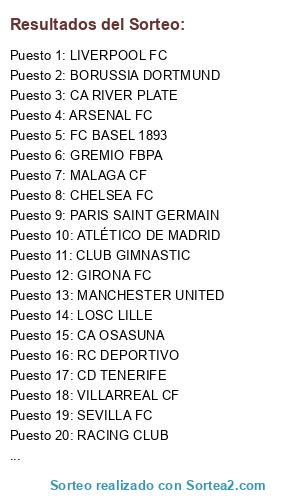 Lista de participantes: ARSENAL FC, ATHLETIC CLUB, ATLÉTICO DE MADRID, FC BARCELONA, FC BASEL 1893, SC BASTIA, REAL BETIS, CADIZ CF, CHELSEA FC, CORDOBA CF, RC DEPORTIVO, BORUSSIA DORTMUND, RCD ESPANYOL, CLUB GIMNASTIC, GIRONA FC, GREMIO FBPA, JUVENTUS, SS LAZIO, LOSC LILLE, LIVERPOOL FC, MALAGA CF, MANCHESTER UNITED, CA NEWELLS OLD BOYS, CA OSASUNA, PARIS SAINT GERMAIN, RACING CLUB, REAL MADRID CF, CA RIVER PLATE, SEVILLA FC, REAL SPORTING, CD TENERIFE, VILLARREAL CF.