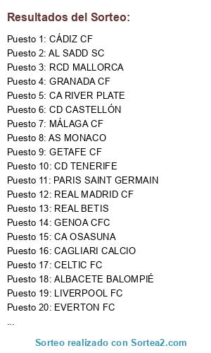 Lista de participantes: CA ALDOSIVI, ANGERS SCO, FC BARCELONA, BOTAFOGO FR, CÁDIZ CF, CSD COLO-COLO, EMPOLI FC, EVERTON FC, CR FLAMENGO, GENOA CFC, GETAFE CF, GRANADA CF, LIVERPOOL FC, OLYMPIQUE LYONNAIS, MANCHESTER UNITED FC, KV MECHELEN, AC MILAN, AS MONACO, SSC NAPOLI, RAYO VALLECANO, REAL MADRID CF, CA RIVER PLATE, AS ROMA, ROYAL CHARLEROI SC, SÃO PAULO FC, SPORTING CP, CD TENERIFE, C. UNIVERSITARIO, VALENCIA CF, VILLARREAL CF, WEST HAM UNITED FC, REAL ZARAGOZA.