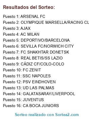 Lista de participantes: GALATASARAY/LIVERPOOL, DEPORTIVO/BARCELONA, PSV EINDHOVEN, SSC NAPOLES, CA BOCA JUNIORS, SEVILLA FC/NORWICH CITY, JUVENTUS, AJAX, FC ZENIT, FC SHAKHTAR DONETSK, REAL BETIS/SS LAZIO, UD LAS PALMAS, ARSENAL FC, OLYMPIQUE MARSELLA/RACING CLUB, CÁDIZ CF/COLO-COLO, AC MILAN.