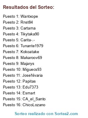 Lista de participantes: Esmart, Wantxope, Edu7373, Cartama, Majarys, JoseNivaria, Tikytaka90, Rnst84, CA_el_Santo, Papitas, Kokoatake, Miguecs93, ChicoLozano, Tunante1979, Makaroov69, Carita-.-.