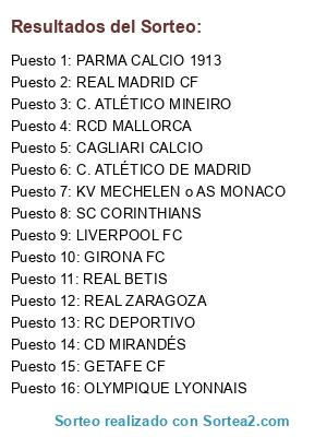 Lista de participantes: SC CORINTHIANS, GIRONA FC, REAL MADRID CF, REAL BETIS, KV MECHELEN o AS MONACO, GETAFE CF, C. ATLÉTICO MINEIRO, LIVERPOOL FC, CD MIRANDÉS, PARMA CALCIO 1913, REAL ZARAGOZA, OLYMPIQUE LYONNAIS, RC DEPORTIVO, RCD MALLORCA, C. ATLÉTICO DE MADRID, CAGLIARI CALCIO.