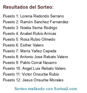 Lista de participantes: María Yañez Cepeda(3 participaciones), Anabel Rubio Arrivas(3 participaciones), Pablo Corral Navarro, Ramón Sanchez Fernandez, Jesus Onsurbe Morales, Victor Onsurbe Rubio, Rosa Rubio Olmedo, Noelia Serna Rodrigo(4 participaciones), Angel Luis Rebato Valero(2 participaciones), Antonio Jose Rebato Valero(2 participaciones), Esther Valero(2 participaciones), Lorena Redondo Serrano(3 participaciones).