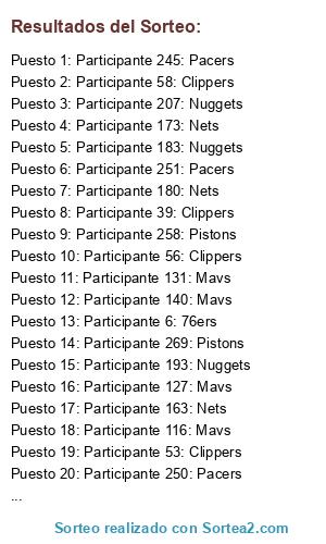 Lista de participantes: Participante 1: 76ers, Participante 2: 76ers, Participante 3: 76ers, Participante 4: 76ers, Participante 5: 76ers, Participante 6: 76ers, Participante 7: 76ers, Participante 8: 76ers, Participante 9: 76ers, Participante 10: 76ers, Participante 11: 76ers, Participante 12: 76ers, Participante 13: 76ers, Participante 14: 76ers, Participante 15: 76ers, Participante 16: 76ers, Participante 17: 76ers, Participante 18: 76ers, Participante 19: 76ers, Participante 20: 76ers, Participante 21: 76ers, Participante 22: 76ers, Participante 23: 76ers, Participante 24: 76ers, Participante 25: 76ers, Participante 26: 76ers, Participante 27: 76ers, Participante 28: 76ers, Participante 29: 76ers, Participante 30: 76ers, Participante 31: 76ers, Participante 32: Clippers, Participante 33: Clippers, Participante 34: Clippers, Participante 35: Clippers, Participante 36: Clippers, Participante 37: Clippers, Participante 38: Clippers, Participante 39: Clippers, Participante 40: Clippers, Participante 41: Clippers, Participante 42: Clippers, Participante 43: Clippers, Participante 44: Clippers, Participante 45: Clippers, Participante 46: Clippers, Participante 47: Clippers, Participante 48: Clippers, Participante 49: Clippers, Participante 50: Clippers, Participante 51: Clippers, Participante 52: Clippers, Participante 53: Clippers, Participante 54: Clippers, Participante 55: Clippers, Participante 56: Clippers, Participante 57: Clippers, Participante 58: Clippers, Participante 59: Clippers, Participante 60: Clippers, Participante 61: Clippers, Participante 62: Clippers, Participante 63: Clippers, Participante 64: Clippers, Participante 65: Clippers, Participante 66: Clippers, Participante 67: Clippers, Participante 68: Clippers, Participante 69: Hawks, Participante 70: Hawks, Participante 71: Hawks, Participante 72: Hawks, Participante 73: Hawks, Participante 74: Hawks, Participante 75: Hawks, Participante 76: Hawks, Participante 77: Hawks, Participante 78: Hawks, Participante 79: Hawks, Participante 80: Hawks, Participante 81: Hawks, Participante 82: Hawks, Participante 83: Hawks, Participante 84: Hawks, Participante 85: Hawks, Participante 86: Hawks, Participante 87: Hawks, Participante 88: Hawks, Participante 89: Hawks, Participante 90: Hawks, Participante 91: Hawks, Participante 92: Hawks, Participante 93: Hawks, Participante 94: Hawks, Participante 95: Hawks, Participante 96: Mavs, Participante 97: Mavs, Participante 98: Mavs, Participante 99: Mavs, Participante 100: Mavs, Participante 101: Mavs, Participante 102: Mavs, Participante 103: Mavs, Participante 104: Mavs, Participante 105: Mavs, Participante 106: Mavs, Participante 107: Mavs, Participante 108: Mavs, Participante 109: Mavs, Participante 110: Mavs, Participante 111: Mavs, Participante 112: Mavs, Participante 113: Mavs, Participante 114: Mavs, Participante 115: Mavs, Participante 116: Mavs, Participante 117: Mavs, Participante 118: Mavs, Participante 119: Mavs, Participante 120: Mavs, Participante 121: Mavs, Participante 122: Mavs, Participante 123: Mavs, Participante 124: Mavs, Participante 125: Mavs, Participante 126: Mavs, Participante 127: Mavs, Participante 128: Mavs, Participante 129: Mavs, Participante 130: Mavs, Participante 131: Mavs, Participante 132: Mavs, Participante 133: Mavs, Participante 134: Mavs, Participante 135: Mavs, Participante 136: Mavs, Participante 137: Mavs, Participante 138: Mavs, Participante 139: Mavs, Participante 140: Mavs, Participante 141: Mavs, Participante 142: Mavs, Participante 143: Mavs, Participante 144: Mavs, Participante 145: Mavs, Participante 146: Mavs, Participante 147: Mavs, Participante 148: Mavs, Participante 149: Mavs, Participante 150: Mavs, Participante 151: Mavs, Participante 152: Mavs, Participante 153: Mavs, Participante 154: Mavs, Participante 155: Mavs, Participante 156: Mavs, Participante 157: Mavs, Participante 158: Nets, Participante 159: Nets, Participante 160: Nets, Participante 161: Nets, Participante 162: Nets, Participante 163: Nets, Participante 164: Nets, Participante 165: Nets, Participante 166: Nets, Participante 167: Nets, Participante 168: Nets, Participante 169: Nets, Participante 170: Nets, Participante 171: Nets, Participante 172: Nets, Participante 173: Nets, Participante 174: Nets, Participante 175: Nets, Participante 176: Nets, Participante 177: Nets, Participante 178: Nets, Participante 179: Nets, Participante 180: Nets, Participante 181: Nuggets, Participante 182: Nuggets, Participante 183: Nuggets, Participante 184: Nuggets, Participante 185: Nuggets, Participante 186: Nuggets, Participante 187: Nuggets, Participante 188: Nuggets, Participante 189: Nuggets, Participante 190: Nuggets, Participante 191: Nuggets, Participante 192: Nuggets, Participante 193: Nuggets, Participante 194: Nuggets, Participante 195: Nuggets, Participante 196: Nuggets, Participante 197: Nuggets, Participante 198: Nuggets, Participante 199: Nuggets, Participante 200: Nuggets, Participante 201: Nuggets, Participante 202: Nuggets, Participante 203: Nuggets, Participante 204: Nuggets, Participante 205: Nuggets, Participante 206: Nuggets, Participante 207: Nuggets, Participante 208: Nuggets, Participante 209: Nuggets, Participante 210: Nuggets, Participante 211: Nuggets, Participante 212: Nuggets, Participante 213: Nuggets, Participante 214: Nuggets, Participante 215: Nuggets, Participante 216: Nuggets, Participante 217: Nuggets, Participante 218: Nuggets, Participante 219: Pacers, Participante 220: Pacers, Participante 221: Pacers, Participante 222: Pacers, Participante 223: Pacers, Participante 224: Pacers, Participante 225: Pacers, Participante 226: Pacers, Participante 227: Pacers, Participante 228: Pacers, Participante 229: Pacers, Participante 230: Pacers, Participante 231: Pacers, Participante 232: Pacers, Participante 233: Pacers, Participante 234: Pacers, Participante 235: Pacers, Participante 236: Pacers, Participante 237: Pacers, Participante 238: Pacers, Participante