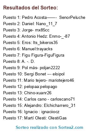 Lista de participantes: Mario tejero- mariotejero46, pelopaa:pelopago, Pol más- poljan2222, Chino-xuanr26, Antonio Hedz: Enmo-_-87, A. -. D., Figu Figura-FiguFigura, Pedro Acosta——- SenorPeluche, Carlos cano - carloscano71, Sergi Bonet --- eloipol, Jorge- mx85cc, Manuel:trayacks, Eros: Its_bikeros35, Ignacio : ignaciiocz, Alejandro: Elchicharrero_31, Martí Olesti: OlestiGas, Daniel: Nano_11_7.
