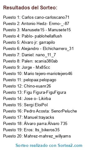 Lista de participantes: pelopaa:pelopago, Antonio Hedz- Enmo-_-87, Chino-xuanr26, Mario tejero-mariotejero46, Figu Figura-FiguFigura, Jorge - Mx85cc, Mahrez-mahrez_willyams, Manuel:trayacks, Álvaro parra:Álvaro 735, Daniel: nano_11_7, Eros: Its_bikeros35, Palen: scania380ab, Alvaro jr: garrapilo, Pedro Acosta: SenorPeluche, Carlos cano-carloscano71, Pablo- pablohellaflush, Sergi EloiPol, Alejandro - Elchicharrero_31, Manusete15 - Manusete15, Jose o- Likirba.