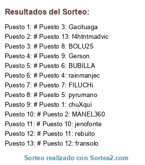 Lista de participantes: # Puesto 1: chuXqui, # Puesto 2: MANEL360, # Puesto 3: Gacituaga, # Puesto 4: rainmanjec, # Puesto 5: pyrumano, # Puesto 6: BUBILLA , # Puesto 7: FILUCHi, # Puesto 8: BOLU25, # Puesto 9: Gerson, # Puesto 10: jenofonte, # Puesto 11: rebuito, # Puesto 12: fransolo , # Puesto 13: f4htntmadvic.