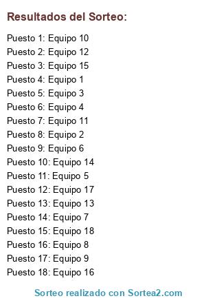 Lista de participantes: Equipo 1, Equipo 2, Equipo 3, Equipo 4, Equipo 5, Equipo 6, Equipo 7, Equipo 8, Equipo 9, Equipo 10, Equipo 11, Equipo 12, Equipo 13, Equipo 14, Equipo 15, Equipo 16, Equipo 17, Equipo 18.