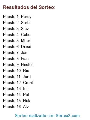 Lista de participantes: Pol, Perdy, Jordi, Sarbi, Ric, Nestor, Ivan, Ini, Alv, Mher, Nok, Cront, Cabe, Jam, Diosd, Slev.