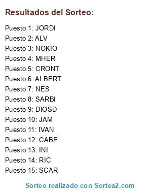 Lista de participantes: RIC, JORDI, IVAN, SARBI, NOKIO, NES, CRONT, SCAR, MHER, CABE, ALV, DIOSD, ALBERT, INI, JAM.