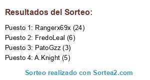 Lista de participantes: Rangerx69x (24), Poolman (18), Leon King (17), ElJuanito (16), CGastaldi (15), Vanmarin (12), Dr.Allback (12), C Castillo (10), Samir G (10), Bolivar35 (9), BitterBet (8), FredoLeal (6), A.Knight (5), Sanson4444 (4), MasterJohn (3), Chino70015 (3), PatoGzz (3), Pinshijuan (3), PonchitoGzz (2), Soy_tu_papi (1), HectorPG (1).