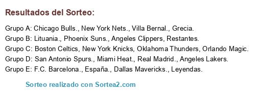 Lista de participantes: Villa Bernal., Real Madrid., Chicago Bulls., Boston Celtics, Angeles Clippers, España., Miami Heat., New York Knicks, Angeles Lakers., Orlando Magic., Dallas Mavericks., New York Nets., San Antonio Spurs., Phoenix Suns., Oklahoma Thunders, Restantes., F.C. Barcelona., Lituania., Grecia., Leyendas..
