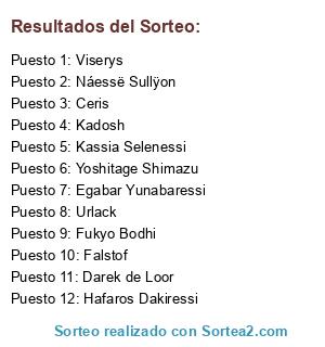 Lista de participantes: Ceris, Urlack, Egabar Yunabaressi, Falstof, Viserys, Darek de Loor, Kassia Selenessi, Hafaros Dakiressi, Fukyo Bodhi, Náessë Sullÿon, Yoshitage Shimazu, Kadosh.