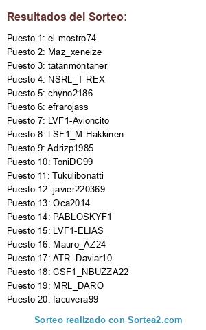 Lista de participantes: el-mostro74, ATR_Daviar10, Oca2014, Maz_xeneize, MRL_DARO, CSF1_NBUZZA22, Adrizp1985, LSF1_M-Hakkinen, chyno2186, LVF1-ELIAS, Tukulibonatti, NSRL_T-REX, LVF1-Avioncito, ToniDC99, PABLOSKYF1, tatanmontaner, Mauro_AZ24, facuvera99, efrarojass, javier220369.