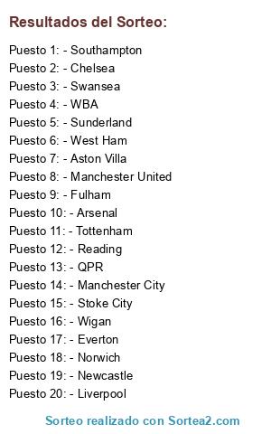 Lista de participantes: - Arsenal, - Aston Villa, - Chelsea, - Everton, - Fulham, - Liverpool, - Manchester City, - Manchester United, - Newcastle, - Norwich, - QPR, - Reading, - Stoke City, - Southampton, - Sunderland, - Tottenham, - Swansea, - WBA, - West Ham, - Wigan.