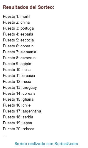 Lista de participantes: alemania, holanda, grecia, rcheca, escocia, gales, serbia, irlanda, croacia, rusia, francia, inglaterra, suecia, españa, portugal, belgica, camerun, ghana, marfil, egipto, chile, uruguay, brasil, usa, corea n, corea s, japon, china, argenntina, zelanda, italia, costa rica.
