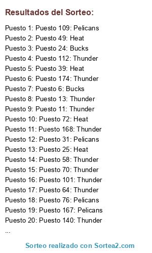 Lista de participantes: Puesto 1: Thunder, Puesto 2: Thunder, Puesto 3: Heat, Puesto 4: Pelicans, Puesto 5: Thunder, Puesto 6: Bucks, Puesto 7: Heat, Puesto 8: Thunder, Puesto 9: Thunder, Puesto 10: Hawks, Puesto 11: Thunder, Puesto 12: Hawks, Puesto 13: Thunder, Puesto 14: Pelicans, Puesto 15: Thunder, Puesto 16: Thunder, Puesto 17: Hawks, Puesto 18: Thunder, Puesto 19: Thunder, Puesto 20: Thunder, Puesto 21: Pelicans, Puesto 22: Thunder, Puesto 23: Hawks, Puesto 24: Bucks, Puesto 25: Heat, Puesto 26: Thunder, Puesto 27: Hawks, Puesto 28: Thunder, Puesto 29: Hawks, Puesto 30: Hawks, Puesto 31: Pelicans, Puesto 32: Thunder, Puesto 33: Hawks, Puesto 34: Thunder, Puesto 35: Thunder, Puesto 36: Thunder, Puesto 37: Thunder, Puesto 38: Thunder, Puesto 39: Heat, Puesto 40: Hawks, Puesto 41: Thunder, Puesto 42: Hawks, Puesto 43: Heat, Puesto 44: Thunder, Puesto 45: Thunder, Puesto 46: Heat, Puesto 47: Thunder, Puesto 48: Heat, Puesto 49: Heat, Puesto 50: Thunder, Puesto 51: Pelicans, Puesto 52: Thunder, Puesto 53: Hawks, Puesto 54: Heat, Puesto 55: Thunder, Puesto 56: Thunder, Puesto 57: Thunder, Puesto 58: Thunder, Puesto 59: Thunder, Puesto 60: Thunder, Puesto 61: Thunder, Puesto 62: Pelicans, Puesto 63: Thunder, Puesto 64: Thunder, Puesto 65: Thunder, Puesto 66: Bucks, Puesto 67: Thunder, Puesto 68: Thunder, Puesto 69: Heat, Puesto 70: Thunder, Puesto 71: Thunder, Puesto 72: Heat, Puesto 73: Heat, Puesto 74: Pelicans, Puesto 75: Thunder, Puesto 76: Pelicans, Puesto 77: Thunder, Puesto 78: Thunder, Puesto 79: Hawks, Puesto 80: Heat, Puesto 81: Hawks, Puesto 82: Heat, Puesto 83: Thunder, Puesto 84: Hawks, Puesto 85: Thunder, Puesto 86: Thunder, Puesto 87: Thunder, Puesto 88: Heat, Puesto 89: Thunder, Puesto 90: Heat, Puesto 91: Hawks, Puesto 92: Thunder, Puesto 93: Thunder, Puesto 94: Pelicans, Puesto 95: Thunder, Puesto 96: Hawks, Puesto 97: Thunder, Puesto 98: Heat, Puesto 99: Heat, Puesto 100: Bucks, Puesto 101: Thunder, Puesto 102: Thunder, Puesto 103: Heat, Puesto 104: Thunder, Puesto 105: Bucks, Puesto 106: Heat, Puesto 107: Heat, Puesto 108: Heat, Puesto 109: Pelicans, Puesto 110: Thunder, Puesto 111: Thunder, Puesto 112: Thunder, Puesto 113: Thunder, Puesto 114: Thunder, Puesto 115: Thunder, Puesto 116: Thunder, Puesto 117: Pelicans, Puesto 118: Thunder, Puesto 119: Hawks, Puesto 120: Thunder, Puesto 121: Bucks, Puesto 122: Pelicans, Puesto 123: Thunder, Puesto 124: Thunder, Puesto 125: Thunder, Puesto 126: Thunder, Puesto 127: Thunder, Puesto 128: Heat, Puesto 129: Thunder, Puesto 130: Pelicans, Puesto 131: Thunder, Puesto 132: Thunder, Puesto 133: Thunder, Puesto 134: Bucks, Puesto 135: Heat, Puesto 136: Thunder, Puesto 137: Thunder, Puesto 138: Thunder, Puesto 139: Heat, Puesto 140: Thunder, Puesto 141: Thunder, Puesto 142: Thunder, Puesto 143: Thunder, Puesto 144: Thunder, Puesto 145: Bucks, Puesto 146: Hawks, Puesto 147: Thunder, Puesto 148: Hawks, Puesto 149: Thunder, Puesto 150: Thunder, Puesto 151: Heat, Puesto 152: Thunder, Puesto 153: Heat, Puesto 154: Thunder, Puesto 155: Thunder, Puesto 156: Thunder, Puesto 157: Thunder, Puesto 158: Heat, Puesto 159: Thunder, Puesto 160: Heat, Puesto 161: Thunder, Puesto 162: Thunder, Puesto 163: Thunder, Puesto 164: Bucks, Puesto 165: Pelicans, Puesto 166: Thunder, Puesto 167: Pelicans, Puesto 168: Thunder, Puesto 169: Thunder, Puesto 170: Bucks, Puesto 171: Hawks, Puesto 172: Thunder, Puesto 173: Heat, Puesto 174: Thunder, Puesto 175: Thunder, Puesto 176: Thunder, Puesto 177: Pelicans, Puesto 178: Pelicans, Puesto 179: Thunder, Puesto 180: Hawks, Puesto 181: Pelicans.