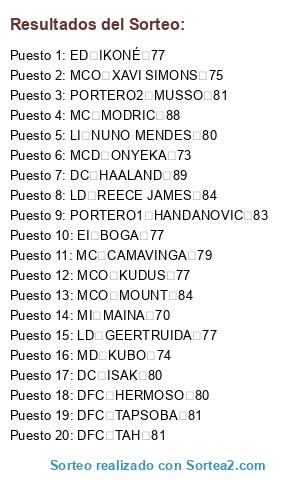 Lista de participantes: PORTERO1 HANDANOVIC 83, PORTERO2 MUSSO 81, LD REECE JAMES 84, DFC TAPSOBA 81, DFC HERMOSO 80, LI NUNO MENDES 80, LD GEERTRUIDA 77, DFC TAH 81, MC MODRIC 88, MC CAMAVINGA 79, MCO MOUNT 84, MD KUBO 74, MCD ONYEKA 73, MCO XAVI SIMONS 75, MCO KUDUS 77, DC ISAK 80, MI MAINA 70, EI BOGA 77, ED IKONÉ 77, DC HAALAND 89.