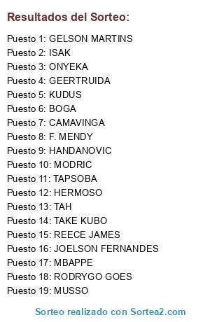 Lista de participantes: EDERSON, MUSSO, TAPSOBA, HERMOSO, GRIMALDO, GEERTRUIDA, TAH, PEDRI, KROOS, MOUNT, KUBO, ONYEKA, MAINA, ISAK, BOGA, RICHARLISON, OSIMHEN, FERRAN TORRES, BOADU.
