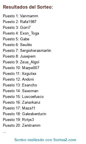 Lista de participantes: Vanmamm, Marpe007, Maza11, Perello, Xernovil, Chisnieto, Rvtys3, Andoni, Xxgutixx, Javiergarcia7, Juanma_10, Zenitramm, Luscoefusco, Tarzandelpro, Exon_Toga, Zeus_Algol, Lionheart, Sergioherasmartin, Siboga, Jusepem, Estupeyonk, Seutito, Lenders, Gorri7, Davies19951995, El_Sucre, A69tepongo, Esancho, Jparram, Gabe, Betikozel, Franmeister, Galesberdurin, Rafa1987, Zanarkanz, Saxoman.