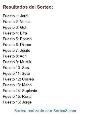 Lista de participantes: Adri, Mario, Jorge, Suplente, Jordi, Guti, Diarce, Sete, Mustik, Sesi, Riera, Vestia, Josito, Correa, Ponzio, Efra.