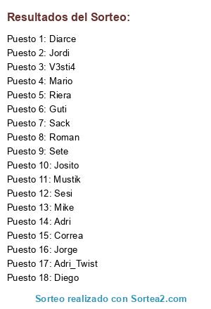 Lista de participantes: Jorge, Adri_Twist, Adri, Jordi, Diarce, Mike, Riera, Roman, Mario, Mustik, Diego, Sesi, Josito, Guti, Sack, Correa, Sete, V3sti4.