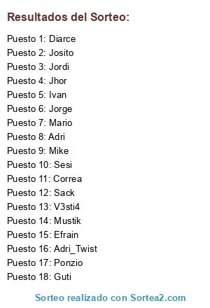 Lista de participantes: Guti, Jorge, Diarce, Ivan, Josito, Adri_Twist, Efrain, Adri, Sesi, Sack, V3sti4, Mustik, Mario, Jhor, Ponzio, Correa, Mike, Jordi.