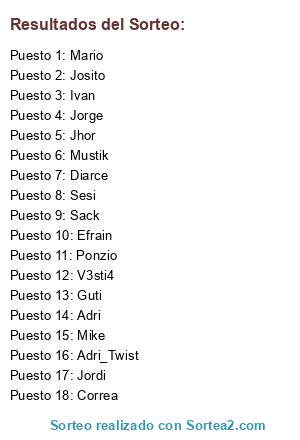 Lista de participantes: Guti, Jorge, Diarce, Ivan, Josito, Adri_Twist, Efrain, Adri, Sesi, Sack, V3sti4, Mustik, Mario, Jhor, Ponzio, Correa, Mike, Jordi.