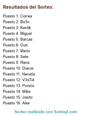 Lista de participantes: Alex, Barcas, Bo3n, Correa, Diarce, Guti, Josito, Kentik, Mario, Mike, Miguel, Neruda, Ponzio, Riera, Sete, V3sTi4.