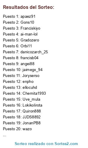Lista de participantes: Aldipe, Adri_casti90, Josedvd89, ai-man-lol, enpho, Joryserso, pablo1093, Midaniel3, Danimese, Quiron888, Gons10, francisb04, fornides, apaez91, wazo, referee_21, pedroeloy95, danicozarch_25, mangel.sl, EduCM, Chemita1993, Orbi11, leticoes, JJDS8892, angei88, sito46, davidg981, alexmar_93, ellocuhd, JonanPB8, Uve_mula, sanmiguel25, Franciskiyo, EasyMoney94, Lokikolirota, pombokiller, jaimegx_94, Gradozero, Sánchez, Alberto9.