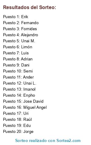 Lista de participantes: Fernando, Unai M., Alejandro, Erik, Adrian, Jorge, Imanol, Enpho, Limón, Ander, Unai L., Jose David, Raúl, Uri, Edu, Luis, Miguel Angel, Fornides, Semi, Dani.
