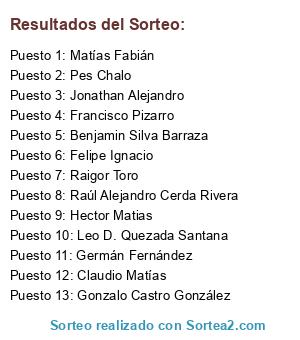 Lista de participantes: Felipe Ignacio, Matías Fabián, Jonathan Alejandro, Pes Chalo, Hector Matias, Germán Fernández, Gonzalo Castro González, Raigor Toro, Raúl Alejandro Cerda Rivera, Leo D. Quezada Santana, Francisco Pizarro, Benjamin Silva Barraza, Claudio Matías.