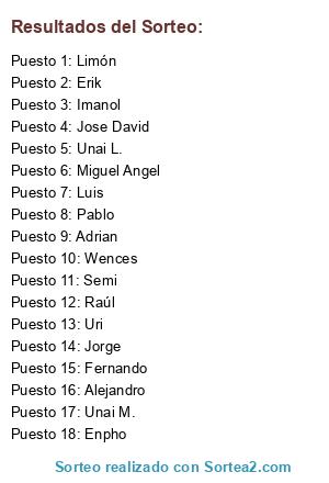 Lista de participantes: Fernando, Unai M., Alejandro, Erik, Wences, Adrian, Jorge, Imanol, Enpho, Limón, Unai L., Jose David, Raúl, Pablo, Uri, Luis, Miguel Angel, Semi.