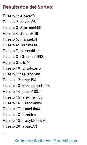 Lista de participantes: Aldipe, Adri_casti90, Josedvd89, ai-man-lol, enpho, Joryserso, pablo1093, Midaniel3, Danimese, Quiron888, Gons10, francisb04, fornides, apaez91, wazo, referee_21, pedroeloy95, danicozarch_25, mangel.sl, EduCM, Chemita1993, Orbi11, leticoes, JJDS8892, angei88, sito46, davidg981, alexmar_93, ellocuhd, JonanPB8, Uve_mula, sanmiguel25, Franciskiyo, EasyMoney94, Lokikolirota, pombokiller, jaimegx_94, Gradozero, Sánchez, Alberto9.