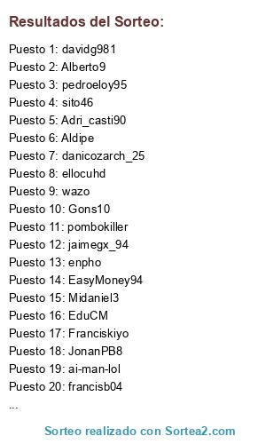 Lista de participantes: Aldipe, Adri_casti90, Josedvd89, ai-man-lol, enpho, Joryserso, pablo1093, Midaniel3, Danimese, Quiron888, Gons10, francisb04, fornides, apaez91, wazo, referee_21, pedroeloy95, danicozarch_25, mangel.sl, EduCM, Chemita1993, Orbi11, leticoes, JJDS8892, angei88, sito46, davidg981, alexmar_93, ellocuhd, JonanPB8, Uve_mula, sanmiguel25, Franciskiyo, EasyMoney94, Lokikolirota, pombokiller, jaimegx_94, Gradozero, Sánchez, Alberto9.