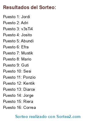 Lista de participantes: Kentik, Diarce, Adri, Mario, Abundi, Jordi, Mustik, v3sTi4, Correa, Guti, Sesi, Josito, Jorge, Ponzio, Efra, Riera.