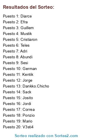 Lista de participantes: Kentik, Diarce, Adri, Mario, Abundi, Jordi, Mustik, v3sTi4, Correa, Guti, Sesi, Josito, Jorge, Ponzio, Efra, Riera.