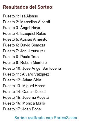 Lista de participantes: Paula Toro, David Somoza, Jon Urrutxurtu, Carles Dulcet, Isa Alonso, Miguel Horno, Ausías Armesto, Jose Angel Santoveña, Josema Acosta, Ezequiel Rubio, Álvaro Vázquez, Ángel Noya, Adam Siria, Joan Pons, Ruben Montero, Marcelino Alberdi, Monica Mallo.