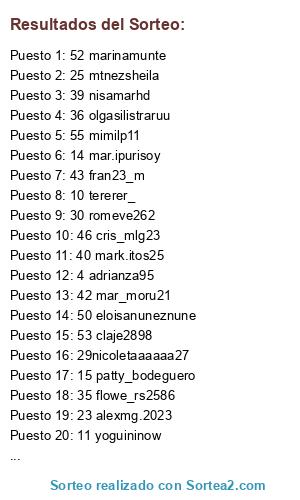 Lista de participantes: 1 Marina.s.g22, 2ana_bocancea, 3angela s, 4 adrianza95, 5 ccmormol, 6maryboop30, 7sanduliakira, 8 loaledr2024, 9 tamytxu, 10 tererer_, 11 yoguininow, 12españolaporelmundo, 13 evamontenc, 14 mar.ipurisoy, 15 patty_bodeguero, 16 sacero1978, 17 jesusperez2546, 18romims85, 19 nisamar.makeup, 20 beautifullylife, 21 siemprehappy, 22 marievis51, 23 alexmg.2023, 24 victoriowr, 25 mtnezsheila, 26 mamen_lopezc, 27dj_diablito1, 28 mercedesfernandeztorres, 29nicoletaaaaaa27, 30 romeve262, 31 estrellavaliente_, 32 cristinagarciaboix, 33 em73bu, 34 aurorasidera, 35 flowe_rs2586, 36 olgasilistraruu, 37 theproclaimer23, 38 lau_fortuna, 39 nisamarhd, 40 mark.itos25, 41 marialaflecha, 42 mar_moru21, 43 fran23_m, 44 eva.sanchezherranz, 45 marta1993_doc, 46 cris_mlg23, 47 11omega28p, 48 mariarozasesp, 49 28soila, 50 eloisanuneznune, 51 marisasalinas63, 52 marinamunte, 53 claje2898, 54 mardima78, 55 mimilp11.