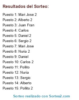 Lista de participantes: Carlos, Alberto, Daniel, Mari Jose, Pollito, Sergio, Nuria, Carlos 2, Alberto 2, Daniel 2, Mari Jose 2, Pollito 2, Sergio 2, Nuria 2, Juan Fran.