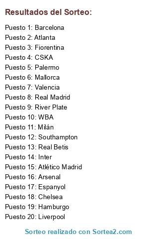 Lista de participantes: Real Madrid, Liverpool, Atlético Madrid, WBA, Chelsea, Inter, Valencia, Arsenal, Hamburgo, Southampton, Real Betis, Fiorentina, River Plate, Milán, Mallorca, Barcelona, Palermo, Atlanta, CSKA, Espanyol.