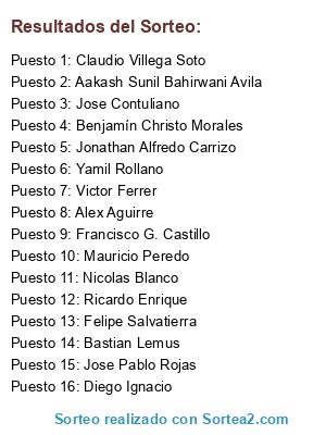 Lista de participantes: Yamil Rollano, Nicolas Blanco, Claudio Villega Soto, Aakash Sunil Bahirwani Avila, Jose Contuliano, Felipe Salvatierra, Alex Aguirre, Francisco G. Castillo, Bastian Lemus, Jose Pablo Rojas, Jonathan Alfredo Carrizo, Mauricio Peredo, Victor Ferrer, Ricardo Enrique, Diego Ignacio, Benjamín Christo Morales.
