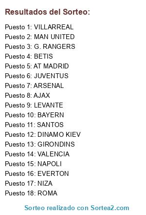 Lista de participantes: AJAX, BAYERN, VALENCIA, NAPOLI, ROMA, MAN UNITED, VILLARREAL, NIZA, JUVENTUS, ARSENAL, SANTOS, LEVANTE, DINAMO KIEV, BETIS, GIRONDINS, G. RANGERS, EVERTON, AT MADRID.