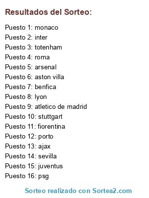 Lista de participantes: juventus, arsenal, atletico de madrid, porto, inter, psg, benfica, monaco, sevilla, roma, totenham, ajax, lyon, stuttgart, aston villa, fiorentina.