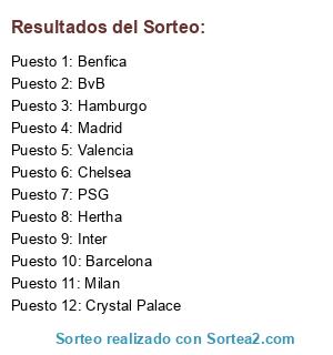 Lista de participantes: Crystal Palace, Hertha, Madrid, Inter, PSG, Chelsea, Milan, Hamburgo, BvB, Benfica, Valencia, Barcelona.