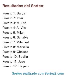 Lista de participantes: Chelsea, M. Utd, A. Vila, Juve, Milan, Inter, Barça, Villarreal, Sevilla, Schalke, Bayern, Marsella.