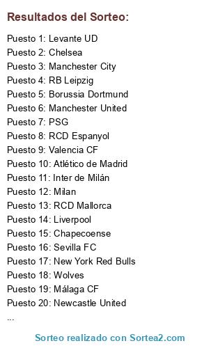Lista de participantes: Inter de Milán, PSG, Wolves, FC Bayern Munich, Borussia Dortmund, Valencia CF, RCD Mallorca, Newcastle United, Manchester United, Málaga CF, Chapecoense, Levante UD, Liverpool, Chelsea, Manchester City, Real Madrid, RB Leipzig, Rayo Vallecano, Milan, New York Red Bulls, FC Barcelona, RCD Espanyol, Sevilla FC, Atlético de Madrid.