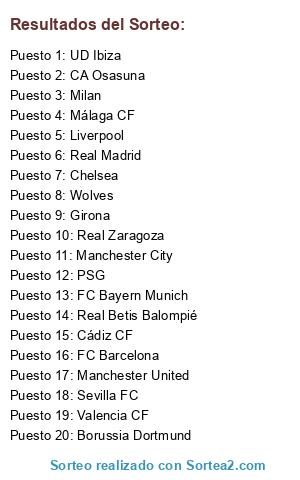 Lista de participantes: Real Betis Balompié, PSG, Wolves, FC Bayern Munich, Borussia Dortmund, Valencia CF, Liverpool, Manchester United, Málaga CF, Real Zaragoza, Chelsea, UD Ibiza, Girona, Manchester City, Real Madrid, Milan, FC Barcelona, Cádiz CF, Sevilla FC, CA Osasuna.