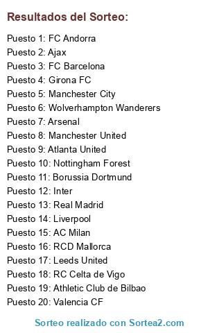 Lista de participantes: Inter, AC Milan, FC Barcelona, Ajax, Athletic Club de Bilbao, Borussia Dortmund, Valencia CF, Arsenal, Nottingham Forest, Wolverhampton Wanderers, Real Madrid, RC Celta de Vigo, Manchester City, Atlanta United, RCD Mallorca, Liverpool, FC Andorra, Manchester United, Leeds United, Girona FC.