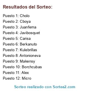 Lista de participantes: Javibosquet, Carisa, Micro, Alex, Juanfema, Cholo, Makensy, Cboya, Berkanuto, Kulebrillas, Antonioneva, Borchcubas.