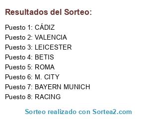 Lista de participantes: RACING, BAYERN MUNICH, CÁDIZ, LEICESTER, M. CITY, ROMA, BETIS, VALENCIA.